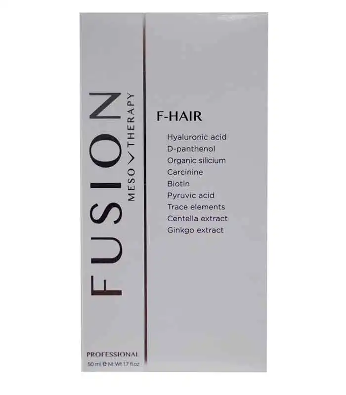 • مزوتراپی مو به معنای تزریق ماده مزو زیر پوست سر است. حالا اگر مواد تزریقی، پایه گیاهی داشته باشند، برخلاف دارو‌های شیمیایی، بدون هیچ عارضه‌ای می‌توانند ریزش مو را متوقف کنند. Fusion، یک برند اسپانیایی است که انواع کوکتل‌های مزوفیوژن را برای درمان‌های زیبایی، به دنیا معرفی کرده است. یکی از کوکتل‌های پرطرفدار فیوژن برای درمان ریزش موی غیر هورمونی، کوکتل درمان ریزش مو فیوژن است. کوکتل مزوتراپی F-HAIR فیوژن، مو‌هایتان را به زندگی باز می‌گرداند و این کار را با داشتن ترکیبات معجزه‌گر خود انجام می‌دهد. از بین این ترکیبات می‌خواهیم اثرات اسید هیالورونیک، سیلیسیم آلی، عناصر مغذی (ویتأمین‌ها، آمینواسید‌ها و مواد معدنی)، عصاره گیاهی Centella Asiatica و عصاره گیاهی Gingko Biloba را بررسی کنیم.